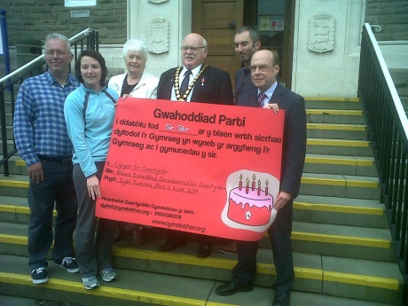Cymdeithas yr Iaith has presented a party invitation to Terry Davies, Chair of Carmarthenshire County Council and Chris Byrne, Deputy Leader of the Council. The invite is to a party at the Council's unit on the National Eisteddfod field in Llanelli next August. The event, which Cymdeithas expect to attract up to 1000 people, will be designed to celebrate the County Council's new strategy for the future of the Welsh language and Welsh-speaking communities in the county.