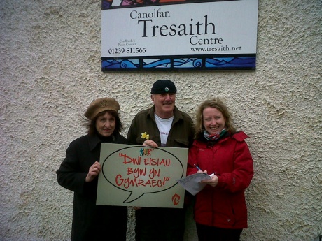 Pop star and one of Tresaith most prominent residents, Dewi 'Pws' Morris, joins the owner of a Welsh tourism business in Tresaith, Dr Dilys Davies, have joined Cymddeithas yr Iaith (the Welsh Language Socie