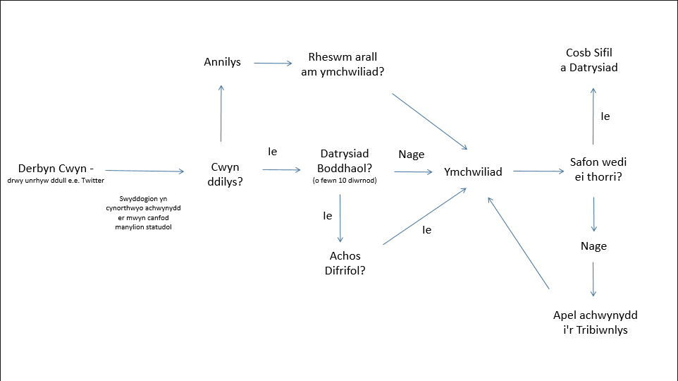 - cwyn > dim datrysiad o fewn 10 diwrnod > ymchwiliad > dyfarniad bod safon wedi ei thorri > cosb a datrysiad