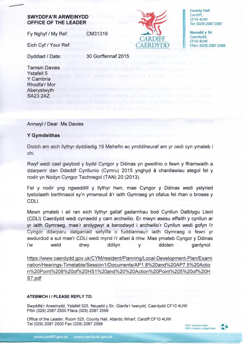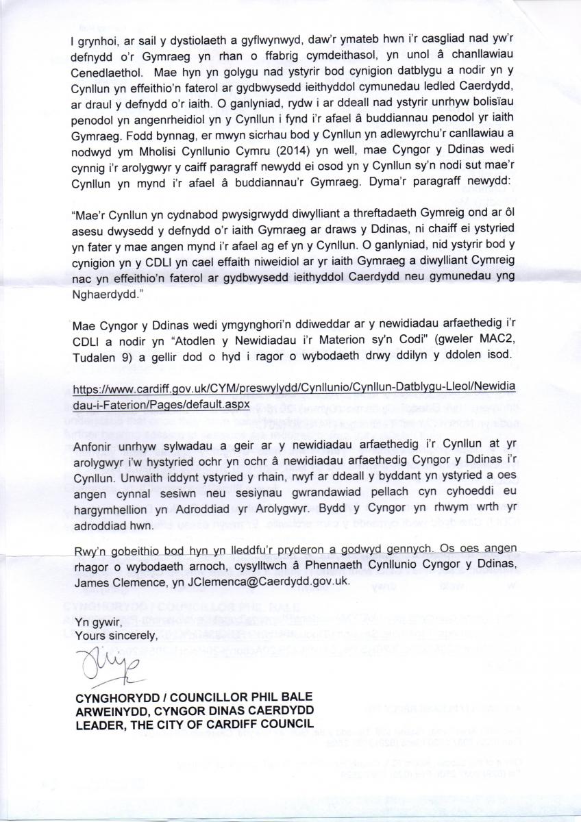Llythyr Cyngor Caerdydd at Gymdeithas yr Iaith (2)