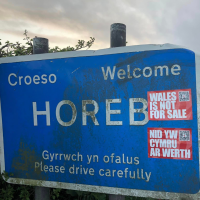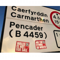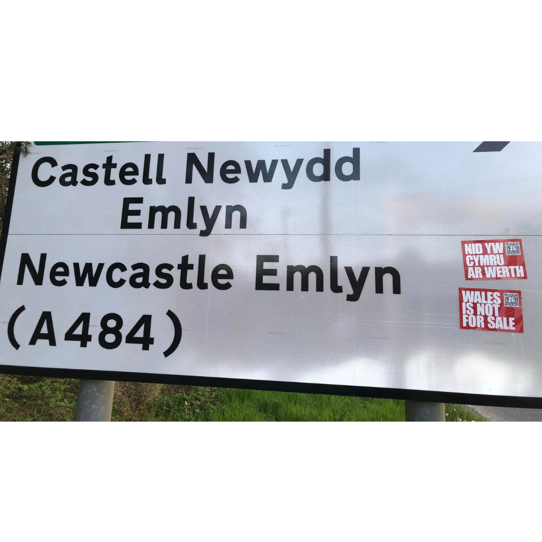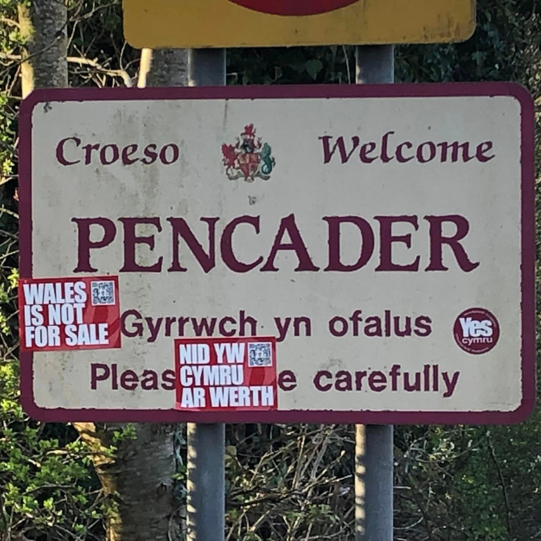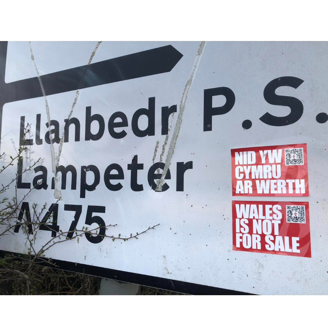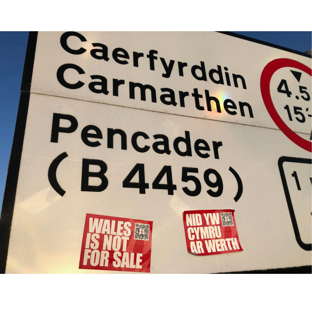 Mae sticeri Nid yw Cymru ar Werth ar gael am ddim yma (bydd angen talu cost postio)