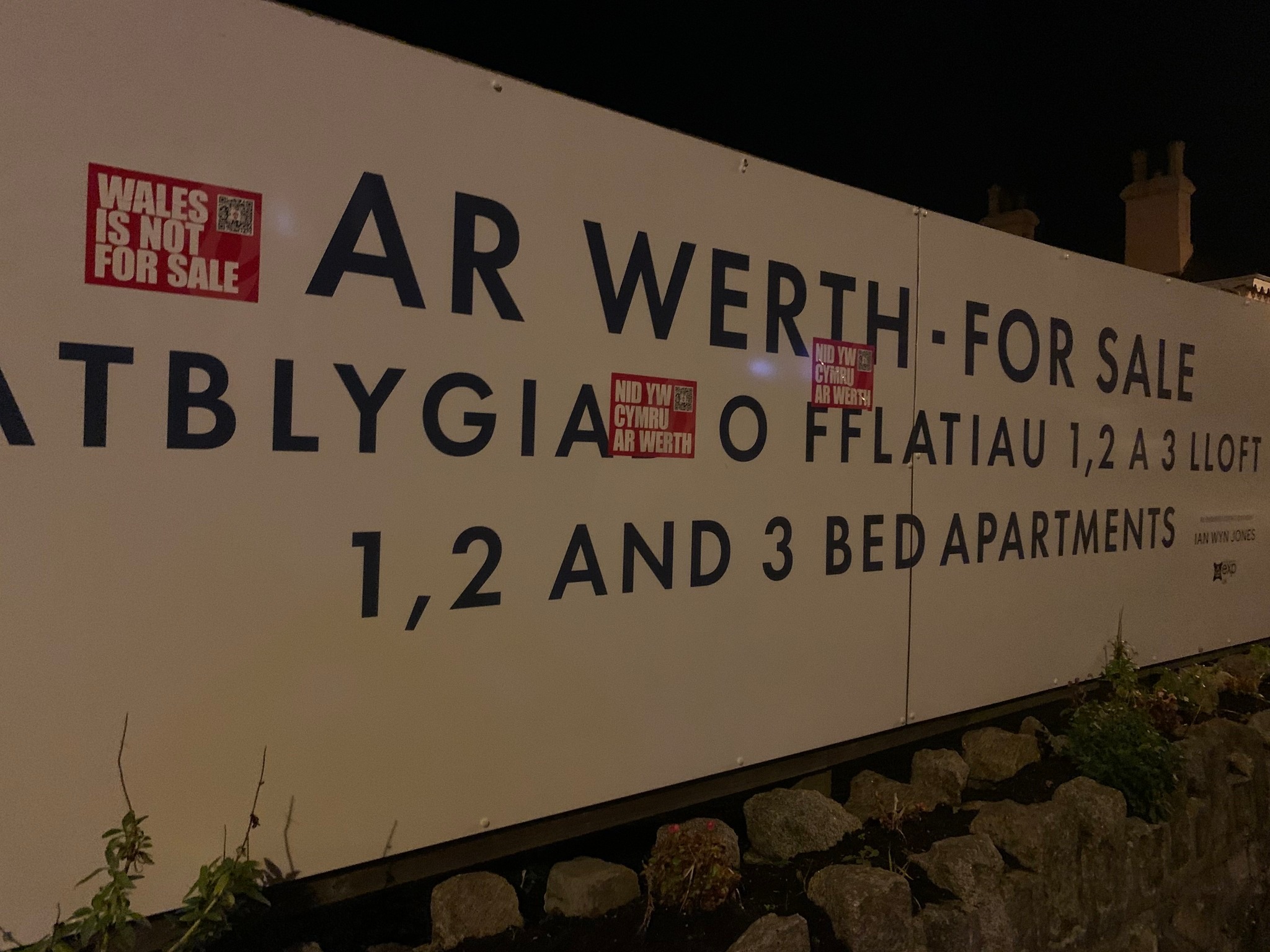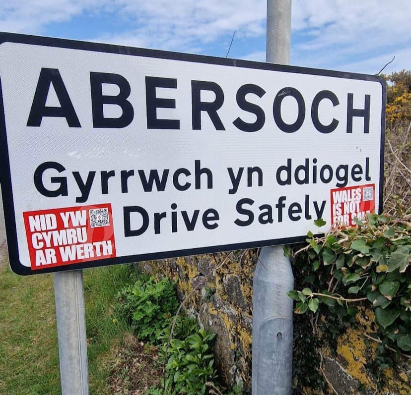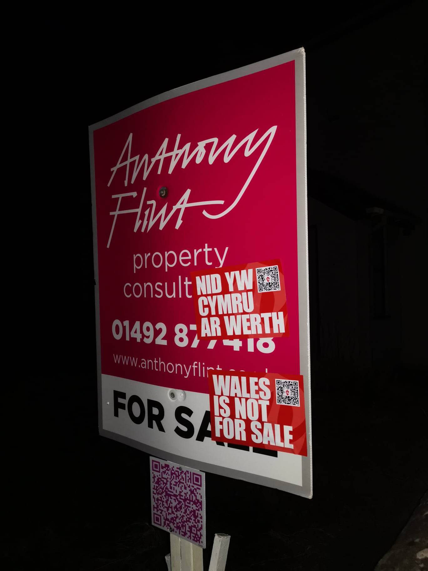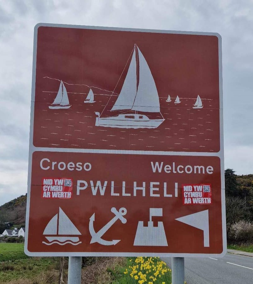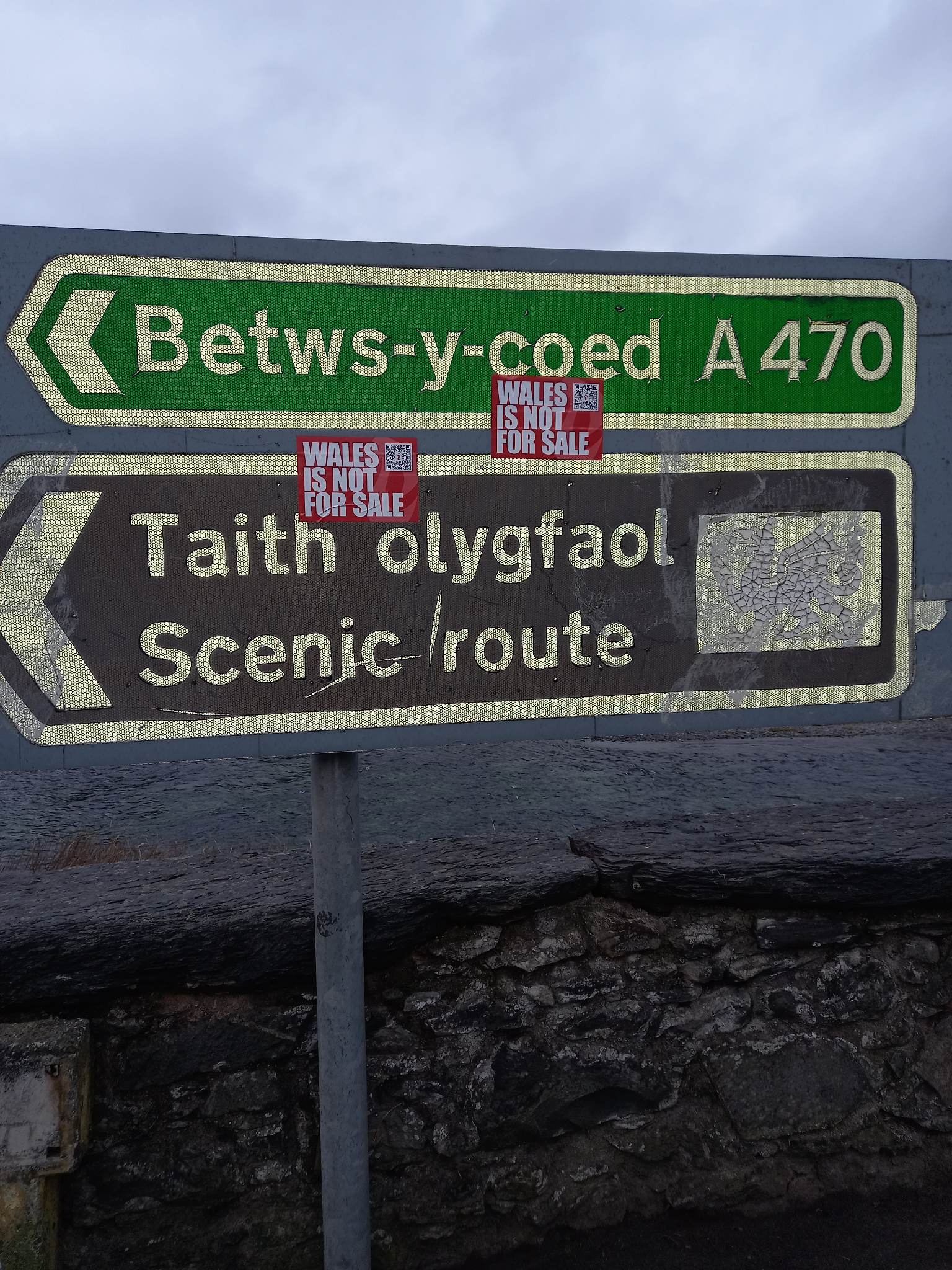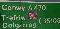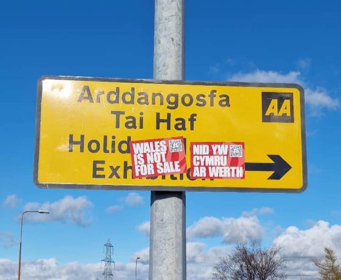 Mae sticeri Nid yw Cymru ar Werth ar gael am ddim yma (bydd angen talu cost postio)