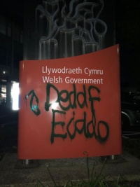 Wythnos cyn rali fawr 'Nid yw Cymru ar Werth' yng Nghaernarfon ar ddydd Llun 8 Mai, mae aelodau Cymdeithas yr Iaith wedi gosod sticeri a pheintio sloganau yn galw am Ddeddf Eiddo ar adeiladau Llywodraeth Cymru yn Aberystwyth, Caerfyrddin a Chyffordd Llandudno.