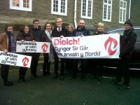 Mae ymgyrchwyr iaith wedi ymgynnull y tu allan i swyddfeydd Cyngor Gwynedd heddiw mewn ymgais i atal toriadau i ganolfannau trochi iaith y sir.