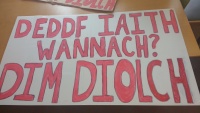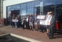 Ar fore agoriad swyddogol y siop newydd, mae pymtheg o aelodau Cymdeithas yr Iaith ynghyd â'r Cynghorydd lleol Arwel Roberts wedi gwrthdystio tu allan a thu fewn i'r siop gan gwyno i reolwyr am y diffyg arwyddion Cymraeg.