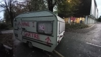 Mae aelodau Cymdeithas yr Iaith wedi gadael hen garafan gyda'r geiriau "Hawl i Gartref" a symbol tafod y ddraig wedi eu paentio ar ei hochr tu allan i swyddfa Llywodraeth Cymru yng Nghaerfyrddin heno (nos Iau, 24 Hydref).
