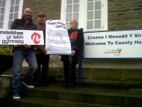 Dywedodd David Williams, isgadeirydd y Gymdeithas yng Nghaerfyrddin, wrth gefnogwyr a oedd yn dal baneri ar risiau Neuadd y Sir -