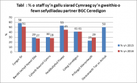 Mae ffigyrau sy'n dangos bod nifer o siaradwyr Cymraeg sefydliadau cyhoeddus yng Ngheredigion wedi gostwng ers 2015 wedi codi cwestiynau am strategaeth hybu'r Gymraeg Ceredigion.