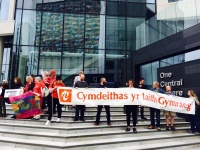 Bu aelodau Cymdeithas yr Iaith yn protestio heddiw yn Sgwâr Canolog Caerdydd er mwyn galw ar Gyngor Caerdydd i fabwysiadu polisïau cynllunio sy'n sicrhau tegwch i'r Gymraeg yn y brifddinas.