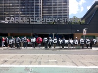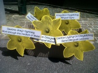 Mae mudiad iaith wedi gwrthdystio y tu allan i orsaf drenau Heol y Frenhines, Caerdydd heddiw i fynnu bod Network Rail yn newid prif arwydd yr orsaf sy’n uniaith Saesneg ar hyn o bryd.