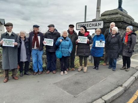 Dechreuodd y daith ar Bont Trefechan cyn ymweld â nifer o leoliadau eiconig yn hanes y mudiad yn Aberystwyth.