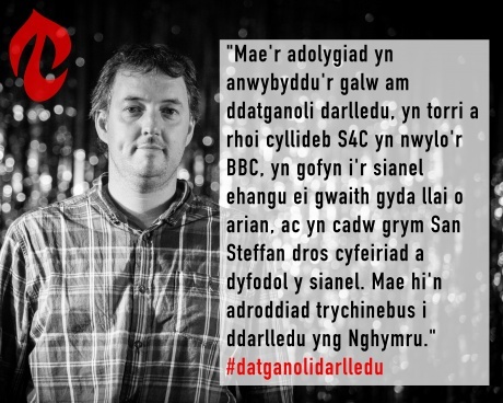 Mae myfyriwr ym Mhrifysgol Aberystwyth wedi cyhoeddi ei fod yn mynd i fynd heb fwyd am saith niwrnod er mwyn pwyso am ddatganoli pwerau darlledu i Gymru.
