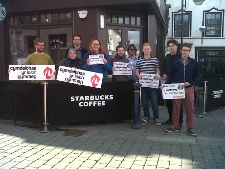 Members of the Pantycelyn group of Cymdeithas yr Iaith have gathered outside Aberystwyth Starbucks today (Friday 29/04) calling on the company to respect the Welsh language.