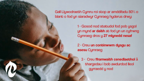 Byddwn ni'n ymateb i ymgynghoriad y Llywodraeth, ac yn annog eraill sydd am weld pob un yn gadael yr ysgol yn gallu defnyddio'r Gymraeg, i ymateb gan alw am Ddeddf Addysg fydd yn: