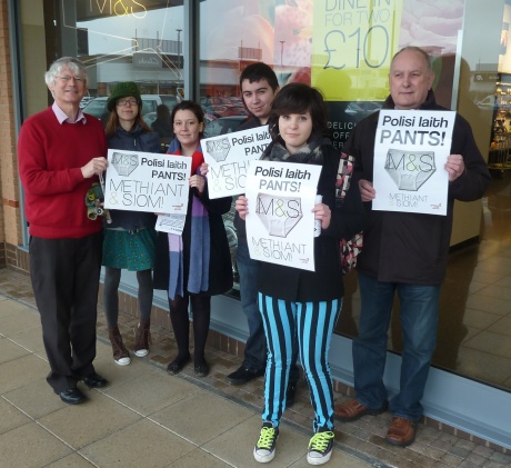 Daeth busnes Marks and Spencer Trostre, ger Llanelli, i stop am hanner awr heddiw (dydd Sadwrn y 25ain o Ionawr) wedi i aelodau o Gymdeithas yr Iaith wrthod talu am eu siopa.