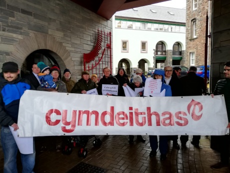 Mae ymgyrchwyr iaith wedi ymgynnull y tu allan i swyddfeydd Cyngor Gwynedd heddiw mewn ymgais i atal toriadau i ganolfannau trochi iaith y sir.