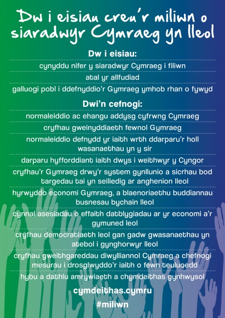 Mewn llyfryn polisi, mae'r mudiad yn galw ar ymgeiswyr yn yr etholiadau ym mis Mai i ymrwymo i gymryd camau er mwyn gwireddu tri nod sydd eisoes wedi ennyn cefnogaeth drawsbleidiol, sef: cynyddu nifer y siaradwyr Cymraeg i filiwn; atal yr allfudiad; a galluogi pobl i ddefnyddio'r Gymraeg ymhob rhan o fywyd.
