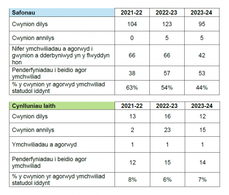Yn 2021/22 fe wnaeth y Comisiynydd ymchwilio i 63% o’r cwynion a dderbyniwyd (66 o’r 104 cwyn ddilys), ond erbyn 2023/24 roedd y ganran wedi disgyn i 44% (42 o’r 95 cwyn ddilys). Mae’r ganran wedi disgyn er bod nifer y cwynion dilys yn is, sy'n golygu bod y Comisiynydd wedi ymchwilio i nifer sylweddol yn llai o gwynion.