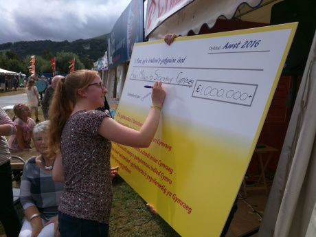 Yn gynharach eleni, bygythiodd banc yr HSBC gau cyfrifon Cymdeithas yr Iaith gan i'r mudiad wrthod llenwi ffurflen Saesneg. Mae'r mudiadau iaith wedi arwyddo'r siec fawr gan addo symud eu holl fusnes bancio i fanc sy'n darparu: