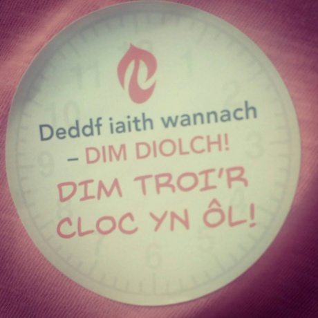 Gosododd yr ymgyrchwyr faneri a sticeri gyda'r sloganau "Deddf Iaith Wannach – dim diolch!" a "Dim troi'r cloc yn ôl" ar stondin y Llywodraeth, wrth i gerddoriaeth o'r nawdegau chwarae yn y cefndir.