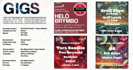 Eleni bydd wythnos gyfan o gigs gyda ni yn Saith Seren a thair noson arbennig yn Neuadd William Aston a noson Bragdy'r Beirdd yng Nghlwb Chwaraeon Brymbo. Mae'r holl docynnau ar werth yn ein siop arlein: siop.cymdeithas.cymru/cynnyrch/gigs ac mae tocynnau Saith Seren a Bragdy'r Beirdd hefyd ar gael o Siop Siwan yn Tŷ Pawb a Saith Seren.